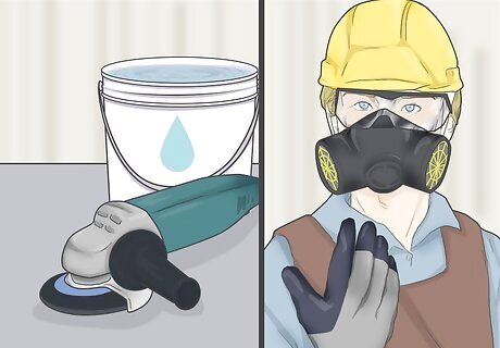 Prepare to fashion your ax-head. For the best possible fit for your tomahawk, you will want to make a corresponding notch to your handle in your stone. First you should make sure you are properly prepared to use your grinder, or other stone cutter, to notch your stone. Cutting stone can create a good amount of dust. You should wear a respirator or, at minimum, a mask to prevent from breathing in this dust. Have a container of cool water nearby. Grinding or cutting stone will create a good amount of heat. You should dunk your stone regularly in your container of water to keep it from overheating. Eye protection is necessary in case a piece of rock or your fiber wheel breaks free during this process. Head protection, like a thick wool hat, can also provide ideal protection if a chipped piece of stone or equipment flies of your grinding wheel.