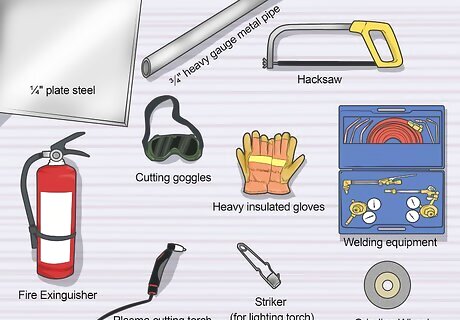 Collect your tomahawk making supplies. To make your own throwing tomahawk will require some metalworking tools and raw material. Before you get started, you should gather: ¼" plate steel ¾" heavy gauge metal pipe Cutting goggles Fire extinguisher Hacksaw Heavy insulated gloves Plasma cutting torch/cutting laser (or other steel cutting tool) Pipe (for handle) Striker (for lighting torch) Welding Equipment File or grinding wheel