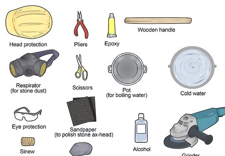 Accumulate your tools and materials. With the use of modern technology, you can make yourself a tomahawk in a primitive style with much less effort and in a shorter period of time. For this endeavor, you will need: Alcohol (or epoxy solvent; optional) Cold water Epoxy Eye protection Grinder or stone cutting saw Head protection Pliers Pot (for boiling water) Respirator (for stone dust) Sandpaper (to polish stone ax-head) Scissors Sinew Stone (for ax-head) Wooden handle
