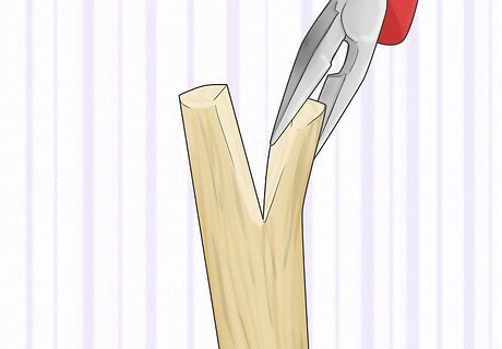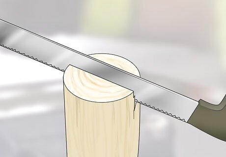 Slot your handle. Your stone tomahawk head will attach to your handle by fitting into its slotted end. Using a hacksaw, cut one end of the handle of your tomahawk so that it is ¾ the diameter of your stone head of your ax.