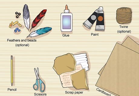 Gather the necessaries. To make your own tomahawk, or to make this as a craft with your kids, you should gather the supplies you'll need before you begin. For this project you will need: Feathers and beads (optional) Glue Paint (gray and brown suggested) Pencil (optional) Scissors Scrap paper (brown preferred) Cardboard Twine (optional)