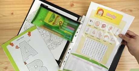 Collect or buy a small-sized binder for each of your children. The binder can be anywhere from 0.5 to 1.5 inches (1.3 to 3.8 cm) wide. Reuse or repurpose an existing binder or purchase a new binder at the dollar store or an office supply store. If you’re able to find a binder with a clear plastic pocket on the front and pockets on the inside, even better (but not necessary). Travel binders could even be useful for teenagers or adults, as you can customize what you put inside.