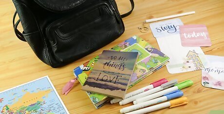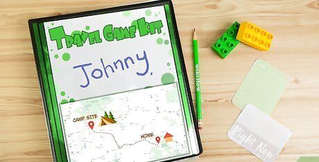Personalize the binders for each of your children. Have your children help you personalize their own binders if you want. Print a cover for each binder that has your child’s name on it and maybe the name of the trip you’re taking (e.g., “European Vacation 2020”). If your binder has a clear plastic pocket on the front, simply slide the cover page into the pocket. Otherwise, use tape or glue to attach the cover to the front of the binder. If your kids want to personalize their own binders, have them write their names with a permanent marker or add a variety of stickers they like to the outside.