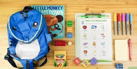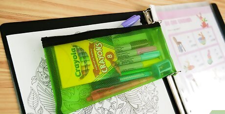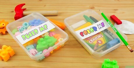 Fill each activity-specific box with the appropriate items. For boxes you’ve labelled as “Build Me,” fill the box with Legos or another set of building/construction toys. For boxes labelled “Colour Me,” fill the box with colouring sheets or a small colouring book and crayons or coloured pencils. For boxes labelled “Play Me,” fill the box with the laminated travel game sheets and a couple of dry-erase markers. For easy transport put all the activity-based boxes inside a tote bag or backpack.
