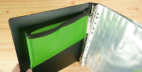 Add a binder pouch to the front of the binder. Binder pouches are pencil cases that are designed to go inside a binder. They typically have 3 grommet holes where the pouch can be secured within the rings of the binder. Place one that you’ve purchased at the dollar store or office support store inside each binder. Alternatively, if you can’t find a pencil case designed for a binder, you can duct tape a flat pencil case to the inside cover of the binder. The purpose of this step is to ensure the pencil case cannot get separated from the binder.