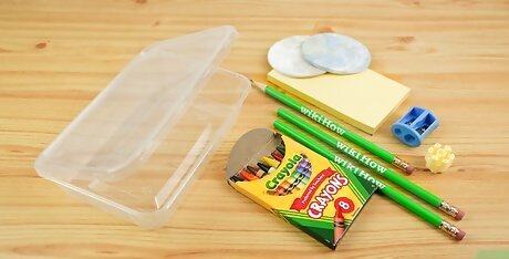 Buy or collect empty hard plastic containers or storage boxes. Purchase small, hard plastic storage containers at a dollar or department store. Look for containers that are at least 8.5 by 5.5 inches (22 by 14 cm) so that they’ll fit items like pencils, sticky notes, and a small notebook. Alternatively, save and clean out containers previously used for things like baby wipes. You could also use hard plastic pencil cases, which can be found where you buy school supplies, or food storage containers.