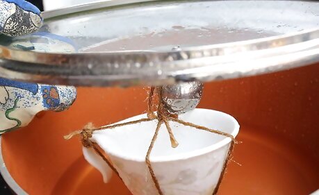 Gather supplies to make a simple distillation system. Commercial home distillation systems can be pretty expensive, but you can make one that achieves similar results using a large stock pot with a lid, a cup, and some twine. Your string should be thick enough and strong enough that it will not break when exposed to moisture. You can also use fishing line or other plastic twine. If you plan to distill water in case of an emergency or natural disaster, it's a good idea to get these materials together before disaster strikes and keep them with other emergency supplies. You might also want to practice the method to make sure you know how to do it.