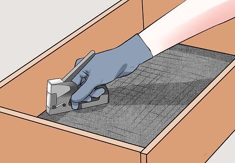 Place the mesh fabric inside against the bottom board. Staple the fabric to the board by stapling along the perimeter of the fabric. The fabric will prevent the worms from leaving the box while still allowing them to breathe.