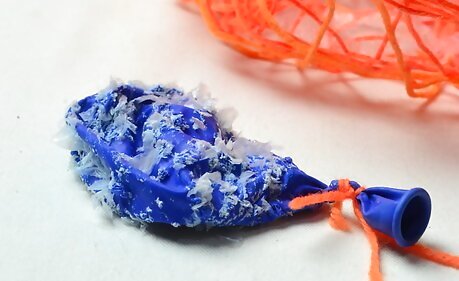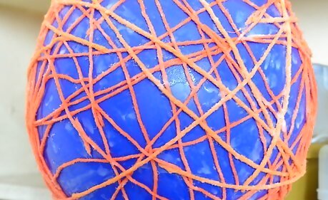 Let the balloon dry. Even though you squeezed the excess glue out of it, it may still drip. It would be a good idea to place some old rags, a cheap tablecloth, or some old newspapers of magazines under it to protect your floor or counter. It will take about 24 hours for the yarn to dry. The yarn likely won't be rock-solid once it dries; it may still have some flex to it.