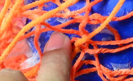 Start wrapping the yarn around your balloon. Hold the balloon steady with one hand, then press the end of the yarn close to the tail with the other. Wrap the yarn around the balloon until you reach the other end. Press down on the end of the yarn to seal it in place. Be sure to change directions every so often.