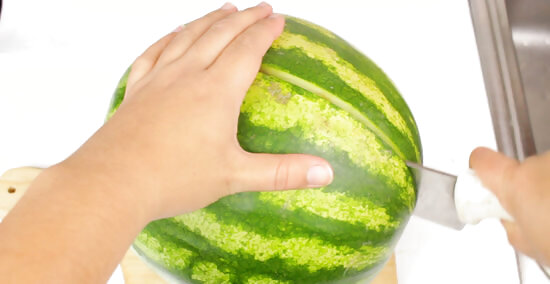 Cut a medium-sized seedless watermelon in half. If you want to make watermelon agua fresca, use a large chef’s knife to split the watermelon down the middle. Save one of the halves for later, because half of the watermelon will yield about 5-6 cups (1000-1200 g) of usable melon scoops. You can also cut the watermelon into rounds, cut off the rind, and then slice it up into pieces from there. Alternatively, if you would rather make cantaloupe agua fresca, you can slice a cantaloupe in half and remove the seeds from one half. Then, chop it into chunks and throw them into the blender.