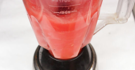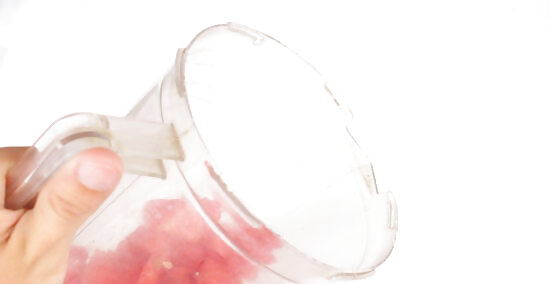 Use a spoon to scoop the insides of the watermelon into a blender. As you get close to the rind, use your spoon to scrape out as much of the melon as you can. You obviously don’t want any of the white rind, but the red and pinks parts are super yummy!
