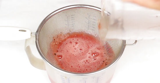 Run the juice through a mesh strainer into a bowl. If you want to remove any seed fibers or pulp from the fruit liquid and be left with a clear mixture, pour the mixture through a strainer. After the liquid passes through, you will be left with a mush of pulp and seed fibers in the strainer. Go ahead and discard this — you won’t be needing it. It’s also totally acceptable (and often considered more traditional) to not strain the juice. Some people prefer the drink with the pulp in it.