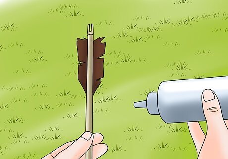 Let the arrow dry again. Let the glue dry for about 2 hours - your exact drying time will vary depending on the type of glue you use and the construction of your arrow. Again, make sure that your arrow is arranged so that neither the feathers or the point of the arrow are bearing any weight as the glue dries - otherwise, they may dry crooked.
