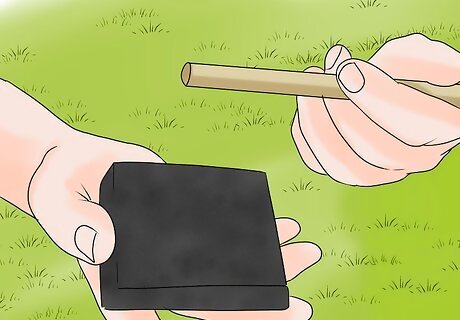 Find a pointed rock. Ideally, your rock should have one sharp, pointed end and one flatter end that fits flush against one end of your stick. Good stones will have a cone-shaped or blade-shaped point and be slightly wider than the stick's thickness. If needed, sharpen your rock's point against another rock or a sharpening stone. Alternatively, you can use sharp pieces of bone if they're available. If you're in an area known for volcanic activity (such as the Hawaiian islands), you may even want to look for naturally-occurring obsidian around old, cooled lava flows. If you're very dedicated (or lucky), you might be able to find an actual arrowhead - that is, a specially-sharpened rock used by an ancient culture to tip an arrow. Arrowheads are occasionally recovered from places where the earth has been disturbed, such as recently-plowed fields, construction sites, and riverbeds.