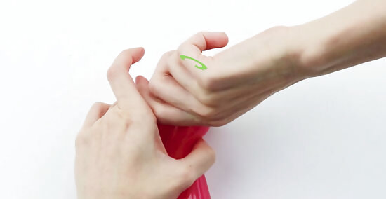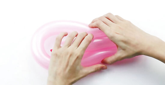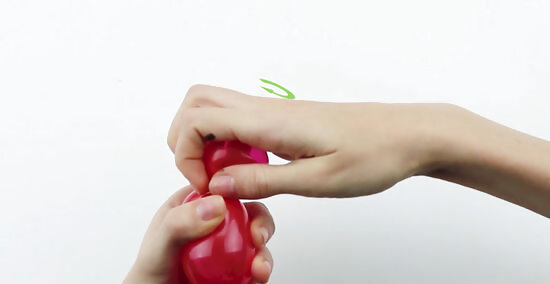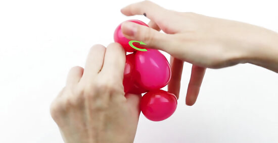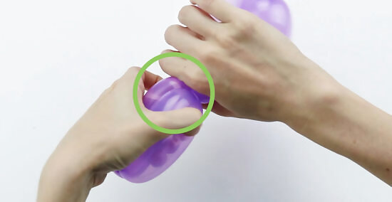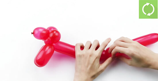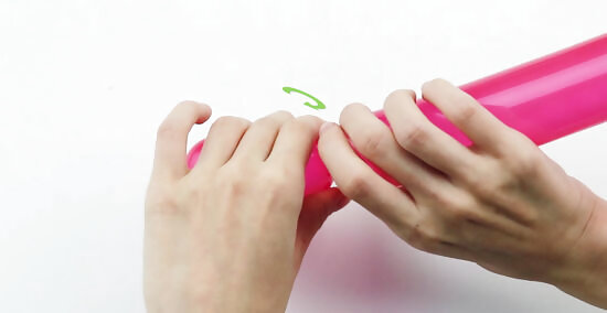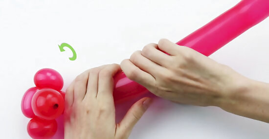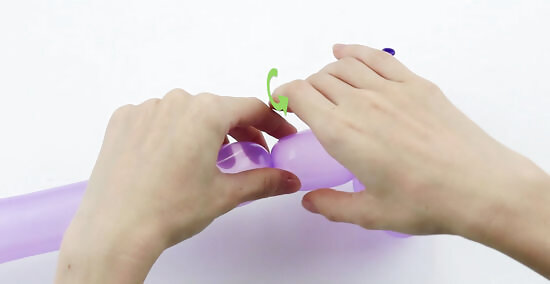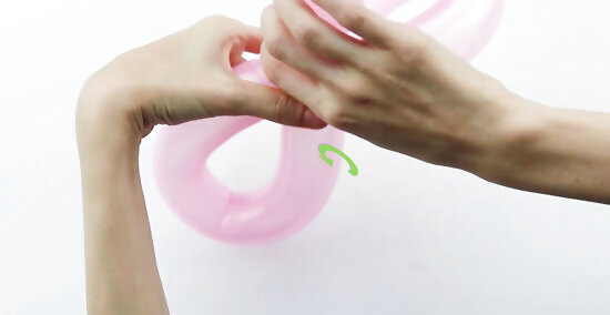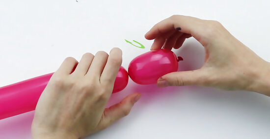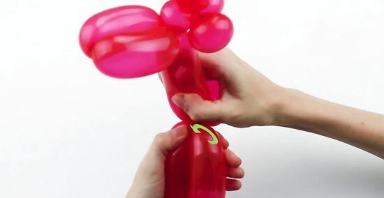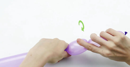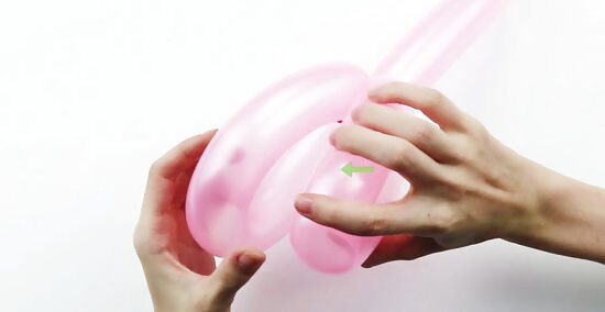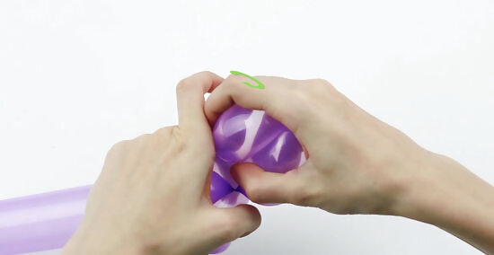 Bend the balloon into a paper clip spiral shape. Roll the ballon in on itself to put the knotted end at the center of the “paper clip” shape. Keep the tail end jutting out from the paper clip. Then, pinch the middle to hold the balloon together.