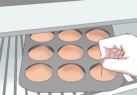 Bake until a toothpick can be inserted in the center and comes out clean. This is because, when fully cooked, the batter will not be sticky, as much of the water cooks out. Don't worry if they are a little over-done. Check after 20 minutes. The most important part is to cook the treats all the way through. Not only can it be dangerous to eat under-cooked eggs, your treat will fall apart. A softer treat, maybe for older dogs, will take less time to cook than a crunchier treat for a dog with stronger teeth. Make sure that no matter what size or crunchiness you wish of your dog treats, you fill each cup of your cupcake pan to the same point, otherwise they will cook unevenly.