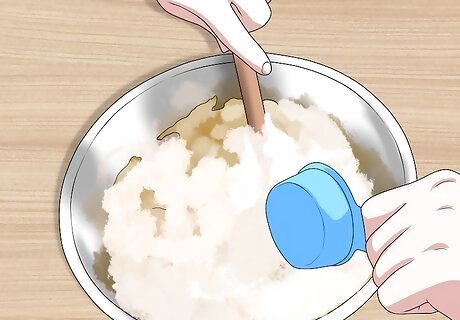 Measure your rice flour into the large bowl. Rice is much easier for dogs to digest than other grain flour. Unlike most other grains, dogs can absorb most of the carbohydrates in rice. It also will help to stabilize you treat, so it doesn't just fall apart once out of the oven.