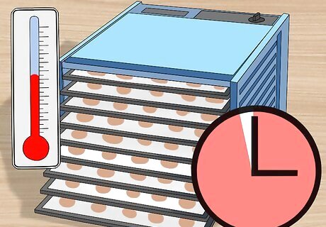 Dehydrate overnight at 125 degrees. There is a delicate balance between the speed and temperature you dehydrate your treats. Like freezing, but unlike baking, dehydrated yogurt can retain its pro-biotic properties. At temperatures above 130° Fahrenheit (55°C), the good bacteria in yogurt will die. To be safe, keep your dehydrator running between 115 and 130° Fahrenheit (45 and 55°C).