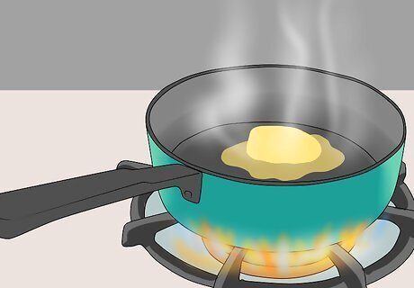 Warm the peanut butter and butter together, until melted. Mix and let cool, but not too much. You should be able to put your finger in it, without hurting yourself. If you do not, you might cook your eggs prematurely, causing them not to mix with the other ingredients. On the stove-top, use a small pot. Warm with low heat. This should not take long. Be careful not to burn it. Butter burns easily. In the microwave, make sure that your bowl or container is microwave-safe. Try 20 to 30 seconds at first. Nuke it longer only if needed. You can burn butter in the microwave just like on the stove. If the butter is mostly melted, give it a stir and wait a minute. It will likely melt more.