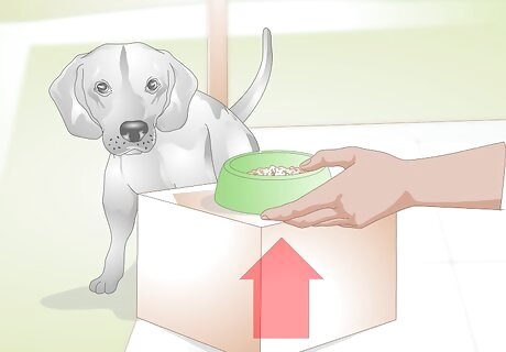 Invest in a raised food bowl. A raised food bowl is a bowl that's raised slightly above the ground. This prevents your dog from feeling strained from leaning their head down to eat. Remember, arthritis greatly limits your dog's mobility, so the less they have to move, the better. If you can't find a raised food bowl, try setting a regular food bowl on a small coffee table or cardboard box that's on your dog's level. There is a slightly higher risk of bloat with a raised bowl, particularly if you have a deep-chested dog, such as a Shepherd or a Great Dane. Watch your dog for signs of discomfort, including whining or excessive scratching, after eating. Avoid exercising your dog within 90 minutes of eating.
