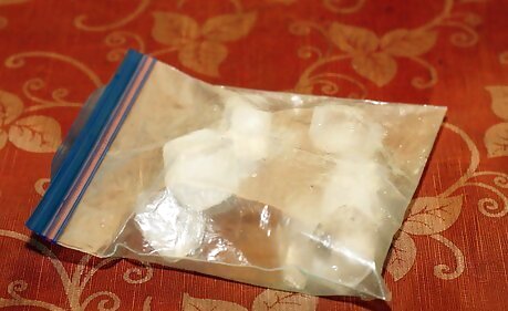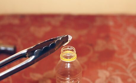 Fill a plastic bag or strainer with ice cubes. While you're letting the bottle sit, prepare your ice. Take some ice cubes from the fridge and place them in a plastic bag or a strainer. Whether you use a bag or strainer depends on the container you're using for your project. Some people use jars instead of bottles for this experiment. If you're using a jar, it's a good idea to set the ice in a strainer, which you should be able to find at a grocery store. The strainer's circular shape makes it fit more easily over a jar. A strainer may not fit easily over the smaller opening in, say, an empty soda bottle. A plastic bag, which is more soft and flexible, can sink slightly into the bottle. This will cover the opening completely. Use a plastic bag if you're using a bottle.