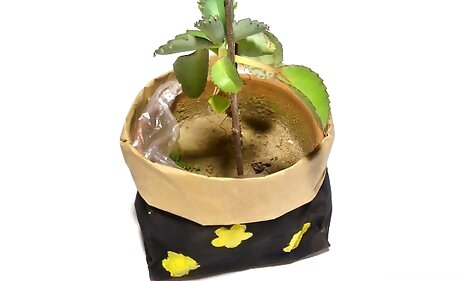Place your potted plant into a plastic bag. Choose a plastic bag, preferably a clear one, that fits your plant's pot. Place the pot into the bag. Don't worry if the fit is not perfect; as long as the bottom portion of the pot is covered, you should be fine. This planter does not have any protective coating, so the bag will keep it from getting ruined. If you don't have a potted plant, you can try filling the bag with soil, and placing a plant into it. This is not recommended however, because the water won't drain properly, and the paper bag will tear if it gets wet. If you can't find a plastic bag, place the plant onto a little dish or saucer instead.