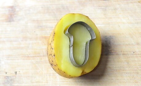Stick a cookie cutter into the potato. Position a small cookie cutter against the cut side of one potato half. Press the cookie cutter into the potato until it is half way in. You will be cutting around the cookie cutter, so it might be best to choose a simpler design.