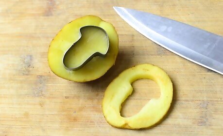 Use a paring knife to cut the negative space out. Press the tip of your knife into the side of the potato until it bumps up against the wall of the cookie cutter. Cut your way around the cookie cutter.