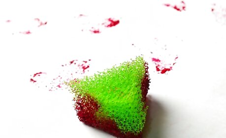 Go simple with sponges. Get a plain, thin sponge and cut it into an interesting shape. Squeeze some acrylic or tempera paint onto a paper plate, then dip your sponge into it. Press the sponge against your wrapping paper, then pull it away. Be careful not to press the sponge too hard against the paper, or the paint may smudge.