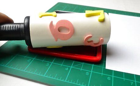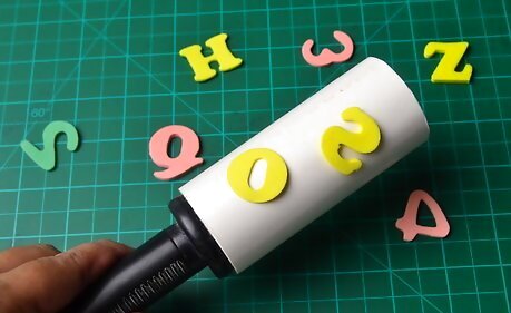 Get a lint roller and peel off the first sheet to reveal a fresh sticky sheet. You will be sticking your shapes to this to make a stamp. Don't worry, this stamp will not be permanent. If you want to change the design later on, you can simply peel off the current sheet, and add more foam pieces to it. If you can't find one, you can use a rolling pin instead, and wrap tape (sticky-side-out) around it.