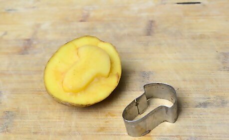 Pull the cookie cutter out, and brush off any excess potato. You should now have raised shape in the center of your potato that is the same shape as your cookie cutter. This is your stamp.