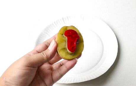 Use cut pieces of fruit to create an organic design. Choose a hard, textured fruit, such as an apple or lemon, and cut it in half. Squeeze some acrylic or tempera paint out onto a paper plate, then dip the fruit into the paint. Press the fruit against your wrapping paper, then pull it away. Some vegetables may also work for this. For example, a bunch of celery cut in half will give you a rose-like design.