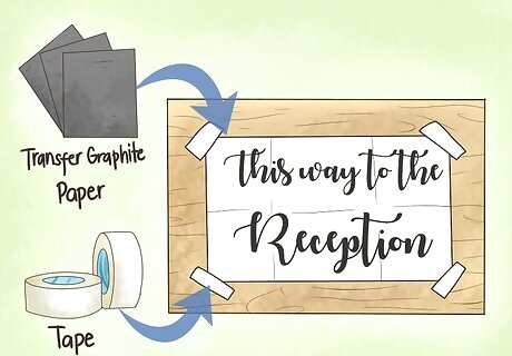 Tape the design on top of the sign. Lay your sign down on a flat surface, then arrange your design pages on top of it. Make sure all the words are the right size before you start drawing. Once you are ready, hold the paper down with masking tape. You can use graphite transfer paper from a craft store to make the design transfer show up better. Place the matte side face-down beneath the design.