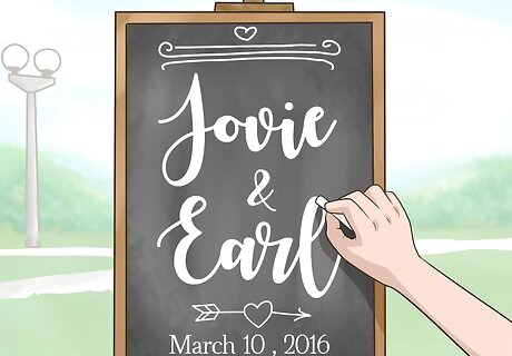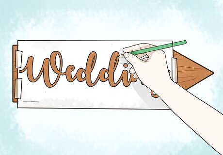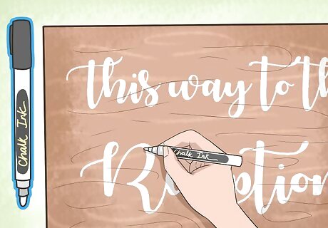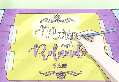Color the design with markers. Chalk ink markers create bright, white lines that match well with the other art on display, like cake or the bride's dress. Use it to outline the letters a second time, then color them in. For more color, try paint or paint markers. All of these supplies are available at most art supply stores.