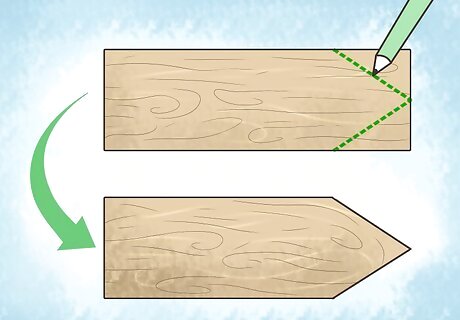 Trace and cut lines on the end of the wood to create the arrow shape. Draw diagonal lines from about 5 in (13 cm) down the longer ends to the center point with a pencil. Once you've drawn your arrow lines, erase and adjust as necessary before cutting. You can cut your arrow lines at your local home improvement store or at home. The measurements vary depending on your sign. Adjust your lines as needed to make them even. If you don’t want to cut the wood, you can also simply draw an arrow on the sign!