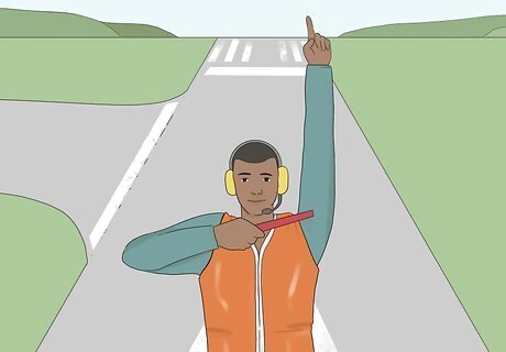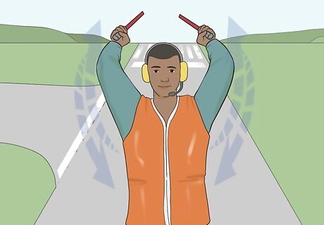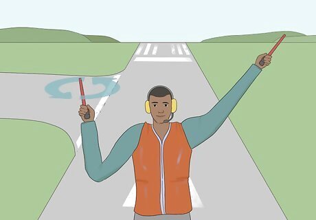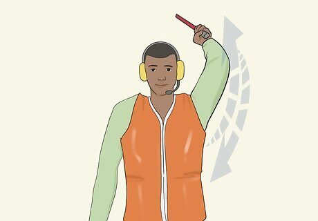 Use a circular wave to have the pilot start the engines. Extend your left arm above your head and hold it steady. Extend your right arm with your elbow bent so that your hand is at ear level. With your right hand, extend your wand or index finger upward and make a twirling motion until the pilot starts the engines.