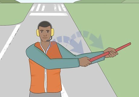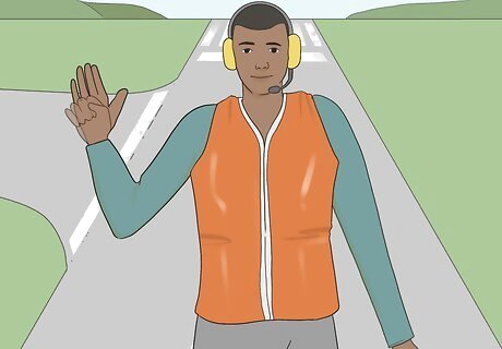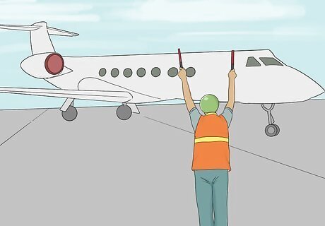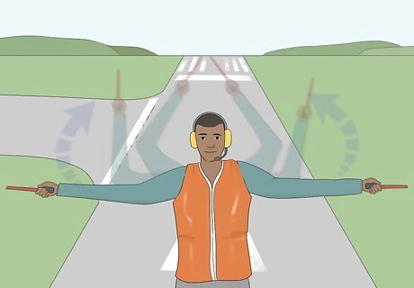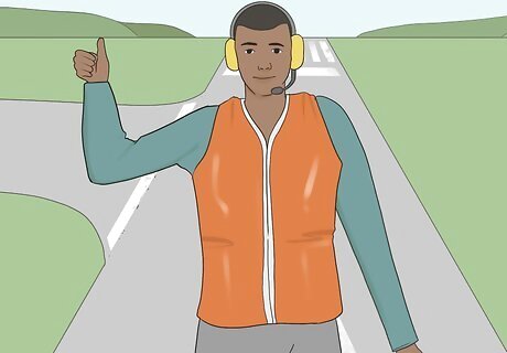 Stand in clear view of the pilot you’re directing. When it’s time to marshall a jet, stand forward of the left wingtip of the plane, far enough out ahead of the aircraft that the pilot can easily see you. Stay within view of the pilot until they are authorized to continue without your direction or have been passed on to another marshall. You’ll get ample instruction on positioning yourself for both visibility and safety during your training to become an aircraft marshall.
