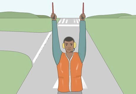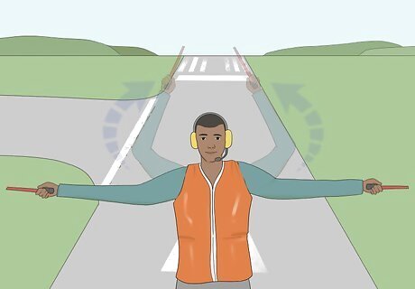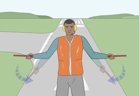 Cross your wands or hands overhead slowly to direct a normal stop. Extend your arms outward to your sides at shoulder height. Slowly raise them overhead and bend your elbows so that you can cross your wands or hands right above your head. The pilot should be able to bring the jet to a full stop just as you cross your wands or hands.