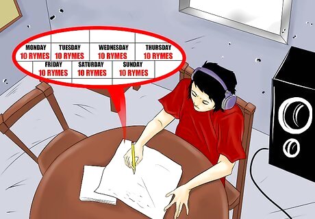 Write lots of rhymes. No one wants to hear recycled rhymes or weak stuff bitten from other rappers, no matter how cool you look or how much swag you've got. The place to start if you want to be a proper MC is working on writing the most creative, unexpected, and catchy rhymes that you possibly can. Get a rhyming dictionary and revise the rhymes you do write to make them more surprising and exciting. Avoid using clichéd or obvious rhymes to pad out your verses. Try to write ten new rhymes a day, even if you're not actively working on writing a song. The lines might develop into their own song, or you'll have something to start with when you get a beat you really like and want to jump on.