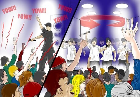 Get people pumped up and moving. As the MC, you're the main attraction. You have to own the stage and get people excited about the show. The DJ's got to keep the beat moving and the hype-man is there to back you up, so the pressure's on. Banter with the audience to get them invested. Cue the DJ to drop the beat and let people sing along once you've coached them on the chorus. If you want people to be into the music, you've got to be into it to. Move around, feel the beat, and look like you're excited to be on stage. If you stand stock-still at the mic stand and look like you're bored, people will look the same way in the crowd.
