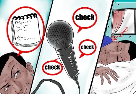 Be confident on stage. If you're well prepared, you should feel confident in your abilities and in your music, so you can throw yourself into putting on the best possible show you can for the people. It's time to shine. Give them a performance they'll never forget. Make sure you've got all your lyrics memorized and have practiced using the mic so you can be confident that all the technical aspects of the performance are going to go off without a hitch. It's hard to perform with confidence if you're trying to remember all the words. It's always important to do a mic check before performing. Part of the work of performance is being there before the show to make sure everything is set up and working as planned. Don't be a fake rock star and blow off the pre-show responsibilities. Be a professional. Always go on stage sober and well-rested. Save the partying for after the show.