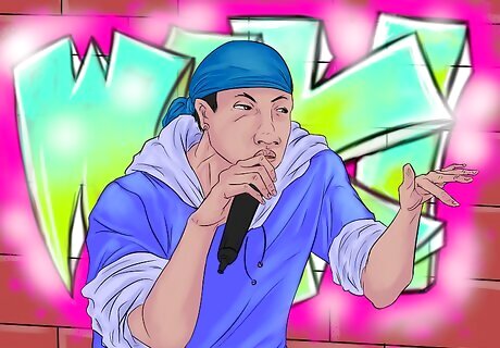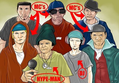 Build up a crew with a distinctive style. As the MC, you'll be the master of ceremonies, the controllers of the mic, and probably the most skilled rapper of the bunch, but to make yourself really stand out, you'll need some help. Aside from your own skills, you'll also need: A DJ who knows how to scratch, mix, and perform. To back you instrumentally, find someone who digs your music and is skilled on the wheels of steel, someone who knows how to hold it down while you perform. It's also a good idea to find someone who's already got all the gear necessary for performing DJ sets live. Go hear some local guys spin on DJ nights and see who catches you ear. A hype-man. Typically, a hype-man is someone who backs you up on the end-rhymes of your songs, adding another layer of texture and volume to your songs. Check out live videos of the Beastie Boys to see how the others come in on the rhyming words to emphasize the song, or how Flavor Flav rocks the stage in early Public Enemy tracks. They're not the main rappers, but a good hype man has stage presence and charisma that makes for a great performance. Complementary MC's. The Wu-Tang Clan was built around the idea that one talented MC was great, but eight would be even greater, especially if unique and unpredictable styles and flows were all included on the same track. Find other rappers who have slightly different styles or personalities to collaborate with in your performances, giving you each an extra element to play off of.