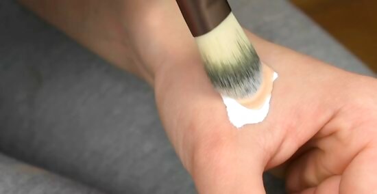 Dip the sponge or brush into the mixed makeup on your hand. Avoid picking up too much to start with so it doesn't look cakey when you go to apply it to your skin. If you’re using a sponge, make sure it’s damp before you dab makeup onto it. Dampen the sponge by running it under cool water so it puffs up and then squeeze out any excess. Use a dry makeup brush to apply the foundation mixture.
