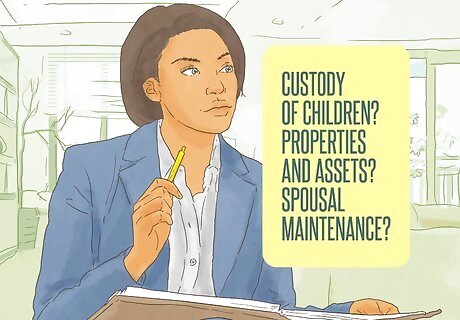 Determine what you want. Go through all of the issues in dispute and decide what your ideal resolution would be. Also determine your priorities. For example, your top priority might be getting the children to live with you during the week. Getting the car or spousal maintenance might be lower priorities. You should also identify what you might be willing to give up. For example, you might be fine with your children spending the weekend with their other parent.