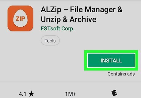 Download and install the ALZip app from the Android Google PlayPlay Store. You can search "ALZip" on the Google Play Store, and tap the green INSTALL button to download it. You can find the app details at https://play.google.com/store/apps/details?id=com.estsoft.alzip.