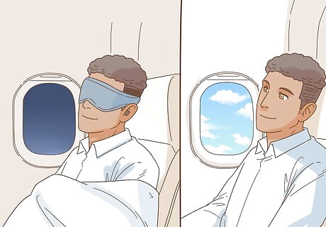 Try to stay on the local schedule while you fly and when you land. Sleep on the plane if it is nighttime at your destination and stay up if it is daytime. Try to stay awake until your regular bedtime when you arrive at your destination to get your body aligned with the local time.Tip: If you wear a watch, then set it to the local time at your destination when you board your flight. This is mostly psychological, but it can help get you in the mindset for where you are going. If you have trouble sleeping on planes, then bring sleep aids like earplugs and an eye mask to block out noise and light. Do your best to stick to the local schedule, but ultimately don't force it. If you feel like sleeping on the plane then you probably need the rest anyways. If you need a nap in the afternoon when you arrive, then limit it to 1-2 hours.