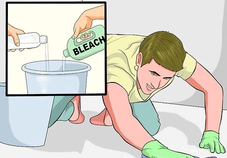 Mix a 3-1 solution of bleach and water to soak and scrub the floor. Let it sit for a few minutes before scrubbing. Make sure you rinse it well when you are done. Seal up any cracks and repair any damage to the concrete after the water has evaporated.