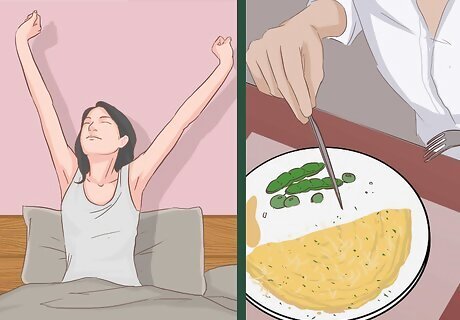 Get 8 hours of sleep the night before and eat well. Having a high energy level is necessary to ensure that you can concentrate and process information efficiently. Go to bed early enough to get a full 8 hours of sleep the night before the exam. Before the exam, drink water to stay hydrated and eat a meal rich in protein, which will last longer in your body and keep you energized. A protein-rich meal, for instance, could be a spinach omelette or lean chicken breast with vegetables. Be sure to use the restroom right before entering your exam room.