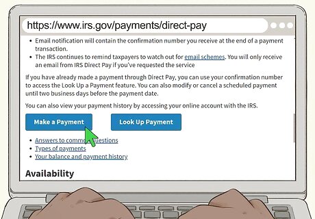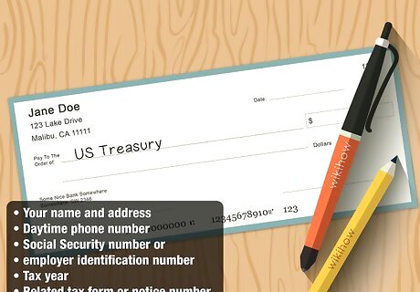 Mail a check or money order if you prefer not to pay online. Even though the IRS website is secure, you may still be nervous about submitting a payment online, especially if it is for a large amount of money. You also have the option of sending a personal check, money order, or cashier's check to the IRS. Make the check payable to "US Treasury" and write your Social Security number on the front. Typically, your payment should be accompanied by a payment voucher. You can download this form at https://www.irs.gov/pub/irs-pdf/f1040v.pdf. The address to which you'll send your payment varies depending on your situation. Go to https://www.irs.gov/payments/pay-by-check-or-money-order, scroll down to "What is your payment situation?" and click on the link that best describes you.